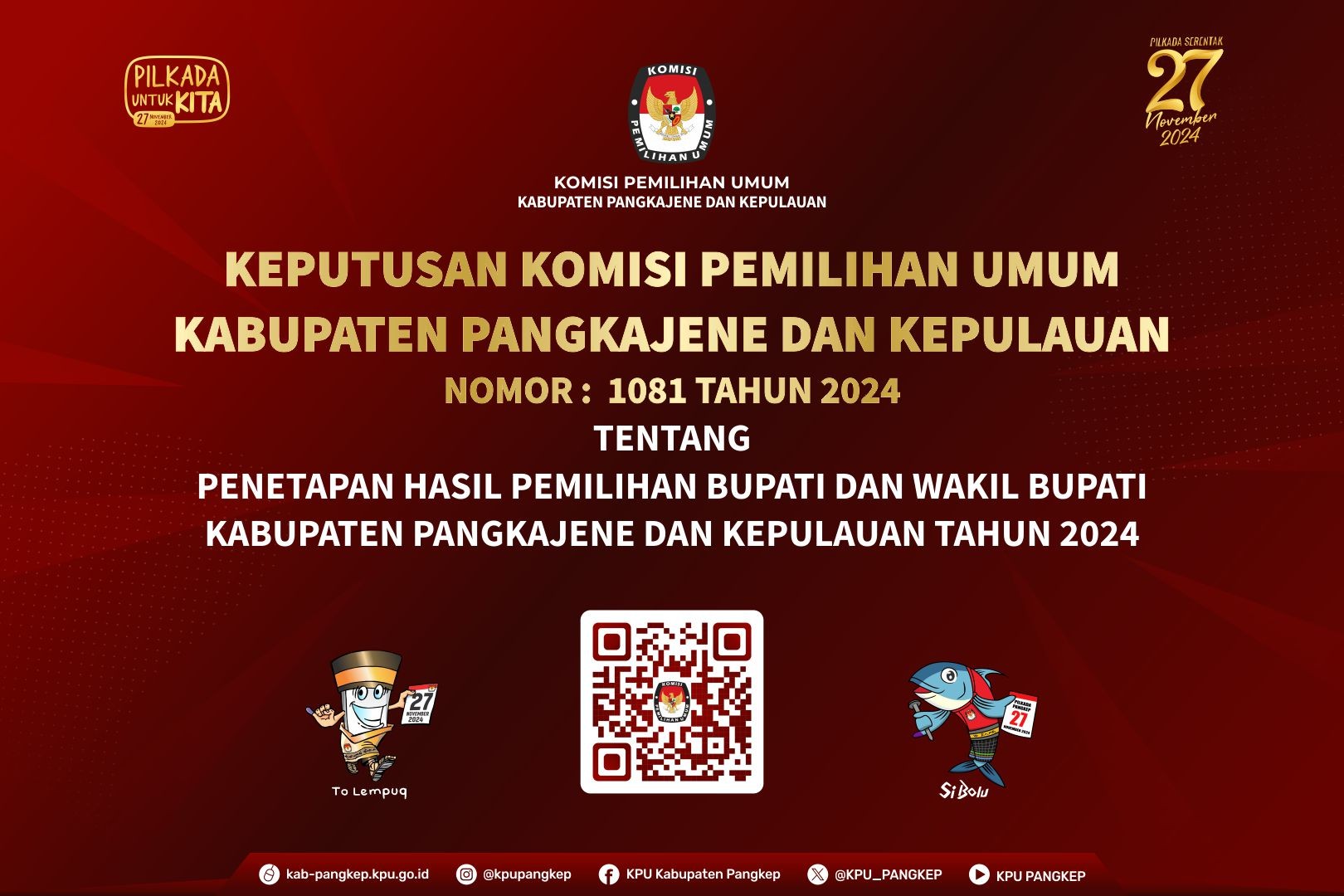 Komisi Pemilihan Umum Kabupaten Pangkajene dan Kepulauan telah menetapkan hasil Pemilihan Bupati dan Wakil Bupati Kabupaten Pangkajene dan Kepulauan Tahun 2024 berdasarkan hasil rapat pleno rekapitulasi penghitungan perolehan suara yang tertuang dalam formulir MODEL D.HASIL KABKO-KWK-BUPATI/WALIKOTA. Adapun dokumen keputusan tersebut dapat dilihat melalui tautan berikut >> SK PENETAPAN HASIL PEMILIHAN BUPATI DAN WAKIL BUPATI PANGKEP <<....