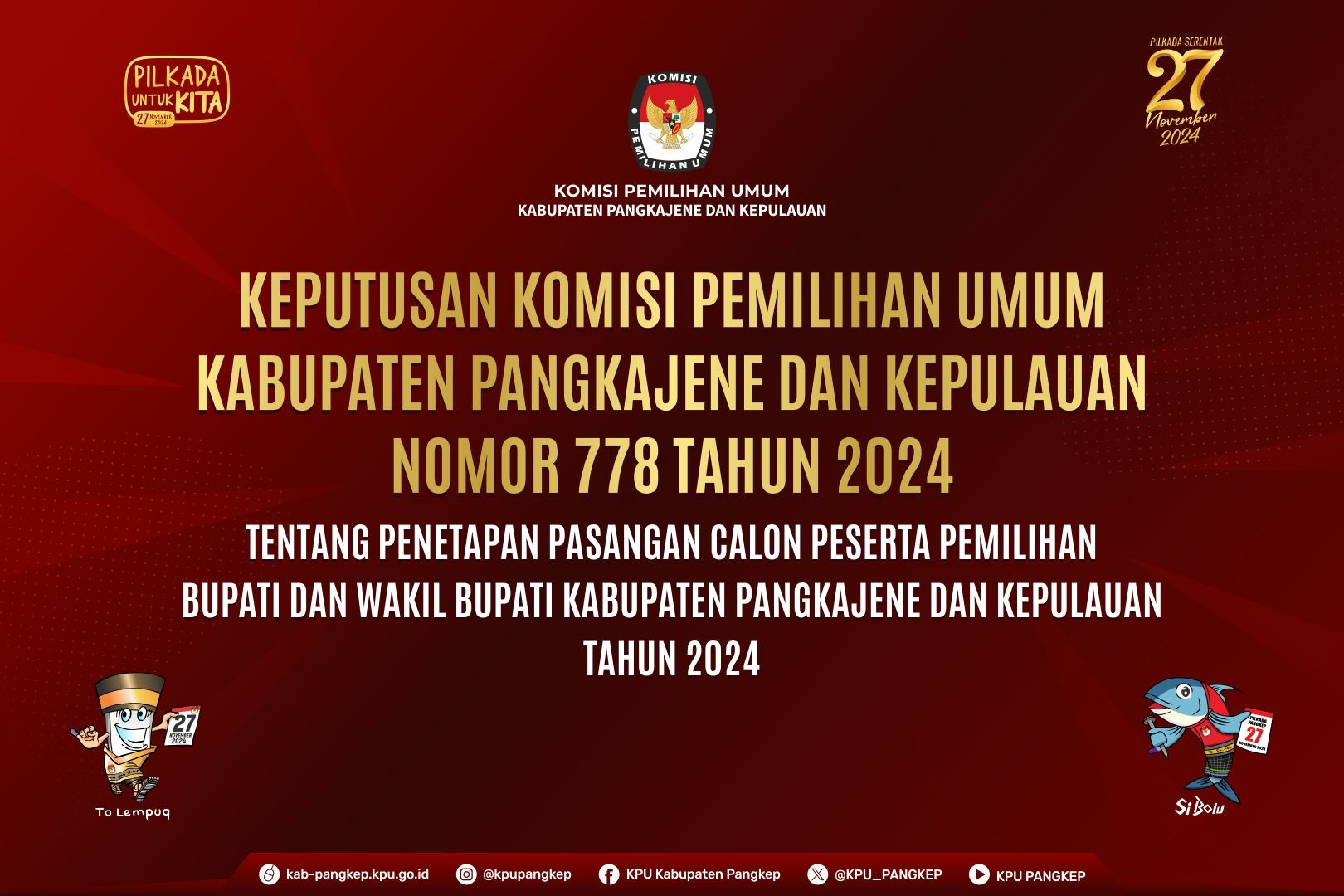 Untuk melaksanakan ketentuan Pasal 8 Peraturan KPU Nomor 13 Tahun 2024 tentang Kampanye Pemilihan Gubernur dan Wakil Gubernur, Bupati dan Wakil Bupati, serta Walikota dan Wakil Walikota, Komisi Pemilihan Umum Kabupaten Pangkajene dan Kepulauan mengumumkan Daftar Tim Kampanye dan Petugas Penghubung Pasangan Calon pada Pemilihan Bupati dan Wakil Bupati Pangkajene dan Kepulauan Tahun 2024.