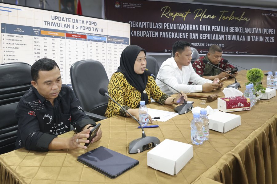 Koordinator Divisi Perencanaan, Data, dan Informasi, Samsudiarti, memaparkan hasil rekapitulasi PDPB. Ia menyampaikan, jumlah pemilih di Kabupaten Pangkep pada triwulan ketiga naik 1,88 persen dibanding periode sebelumnya, dari 253.005 menjadi 257.764 pemilih. Rinciannya, 123.998 pemilih laki-laki dan 133.766 pemilih perempuan. Peningkatan ini terjadi di seluruh kecamatan. Sumber data PDPB berasal dari DP4, masukan masyarakat, serta hasil koordinasi dengan instansi terkait.