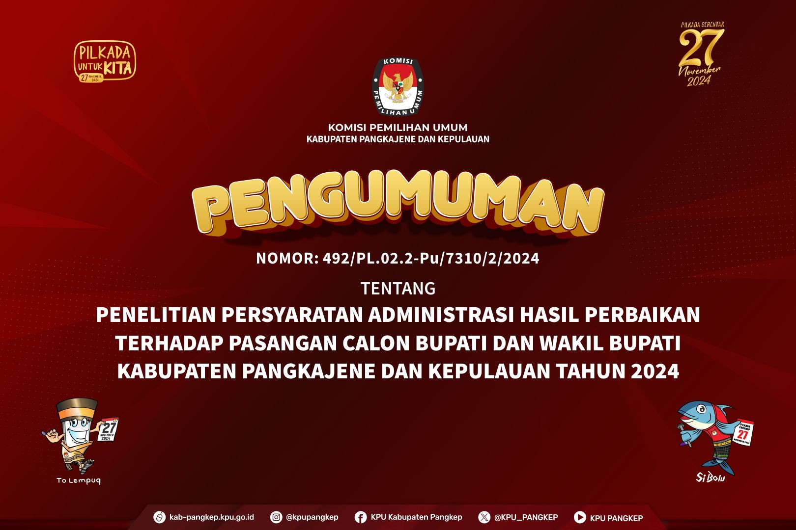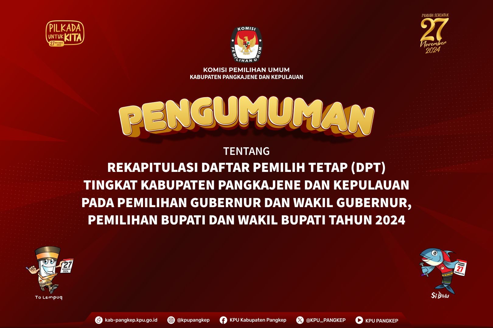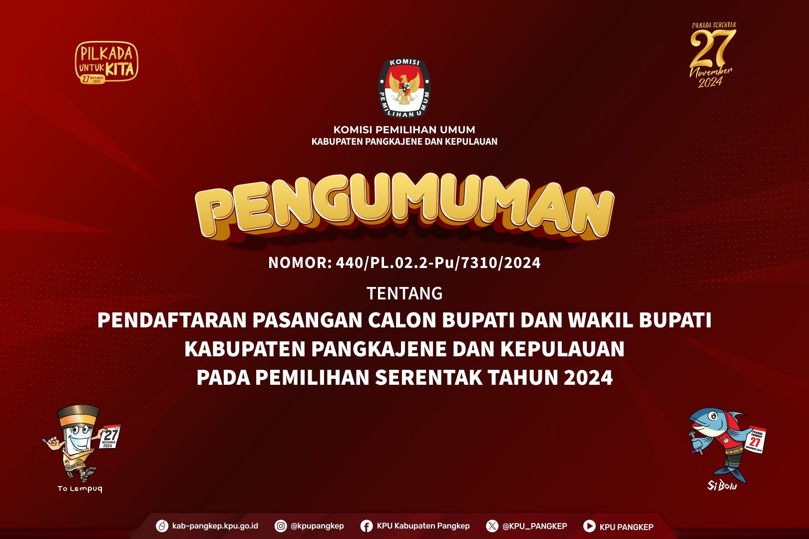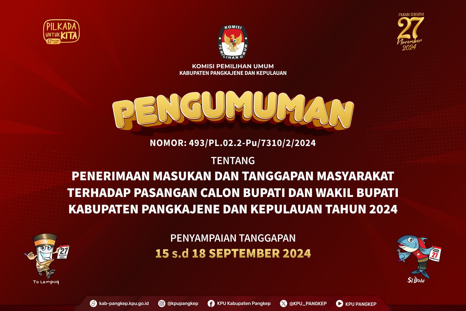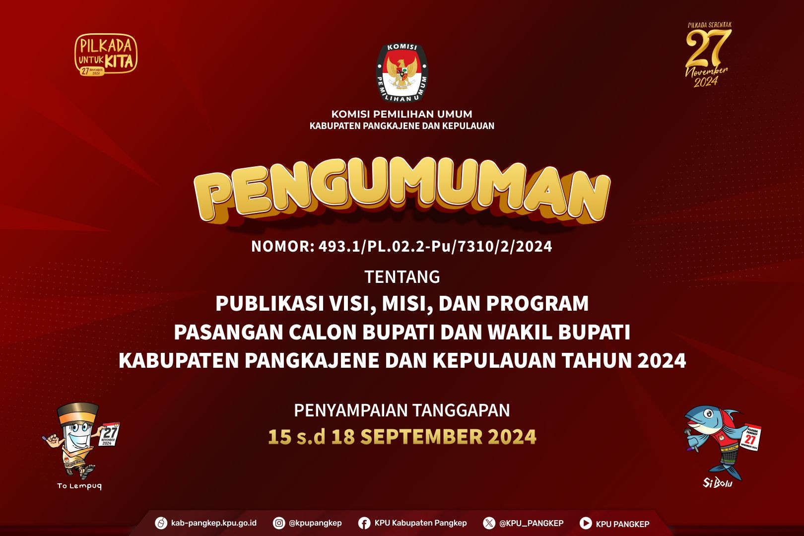 Komisi Pemilihan Umum Kabupaten Pangkajene dan Kepulauan mengumumkan visi, misi, dan program Pasangan Calon Bupati dan Wakil Bupati Kabupaten Pangkajene dan Kepulauan Tahun 2024, dimana masyarakat dapat memberikan masukan dan tanggapan terkait hal tersebut.