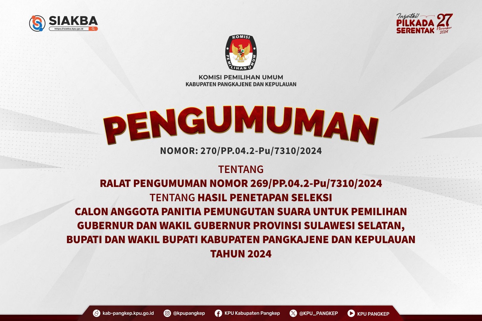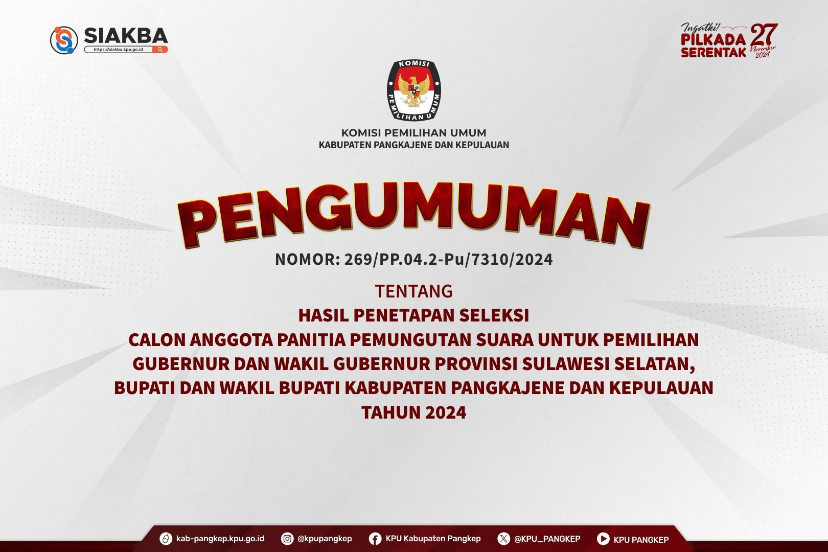 Sehubungan dengan Pengumuman Komisi Pemilihan Umum Kabupaten Pangkajene dan Kepulauan sebelumnya tentang Hasil Penetapan Seleksi Calon Anggota Panitia Pemungutan Suara untuk Pemilihan Gubernur dan Wakil Gubernur, Bupati dan Wakil Bupati Tahun 2024, disampaikan beberapa hal sebagai berikut: Komisi Pemilihan Umum Kabupaten Pangkajene dan Kepulauan menetapkan calon anggota Panitia Pemungutan Suara peringkat 1-3 ditetapkan sebagai calon Anggota Panitia Pemungutan Suara (PPS) yang terpilih dan calon Anggota Panitia Pemungutan Suara peringkat 4-6 sebagai calon Pengganti Antarwaktu anggota Panitia Pemungutan Suara. Bahwa Berdasarkan Poin 1 (Satu) di atas dimana ketentuan tersebut juga telah disampaikan pada pengumuman sebelumnya di poin 2 (dua) pada PENGUMUMAN NOMOR 269/PP.04.2-Pu/7310/2024 Tentang Hasil Penetapan Seleksi calon Anggota Panitia Pemungutan Suara Terpilih untuk Pemilihan Gubernur Dan Wakil Gubernur, Bupati Dan Wakil Bupati Kabupaten Pangkajene dan Kepulauan Tahun 2024. Maka berdasarkan hal tersebut telah dilakukan perbaikan sebagaimana data terlampir pada Pengumuman Nomor 270/PP.04.2-Pu/7310/2024 yang dapat diunduh melalui link berikut: Unduh >> di sini <<