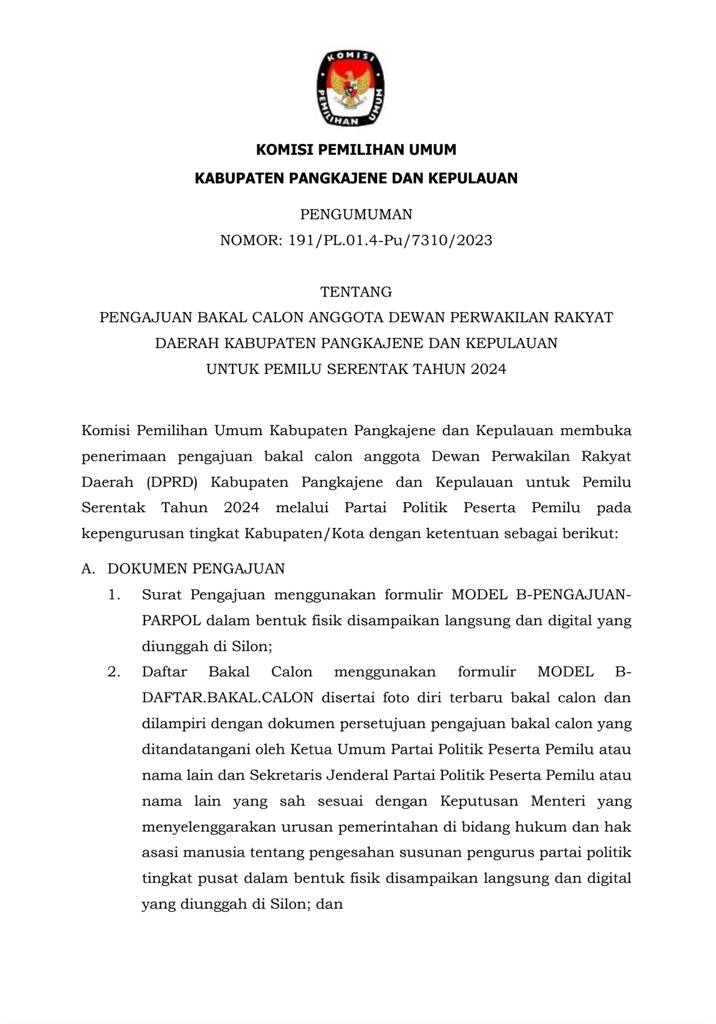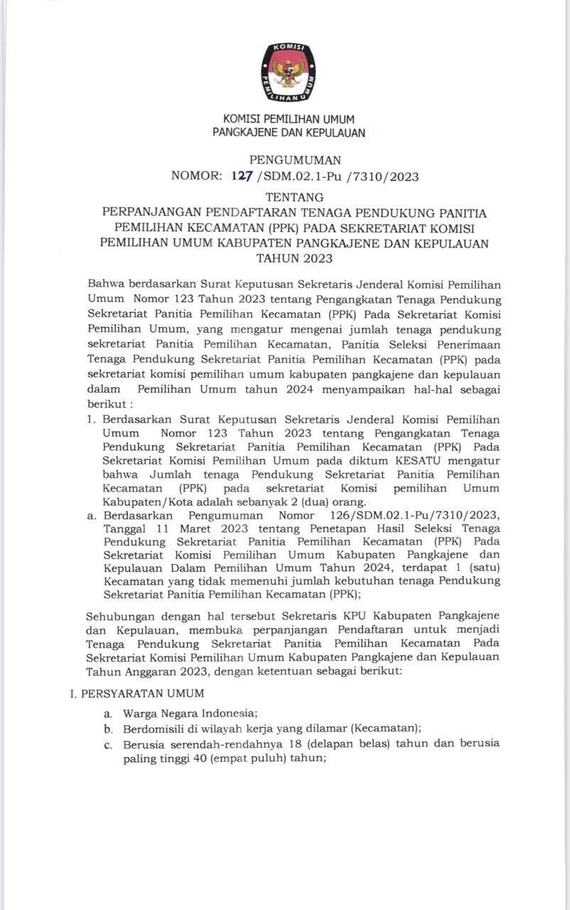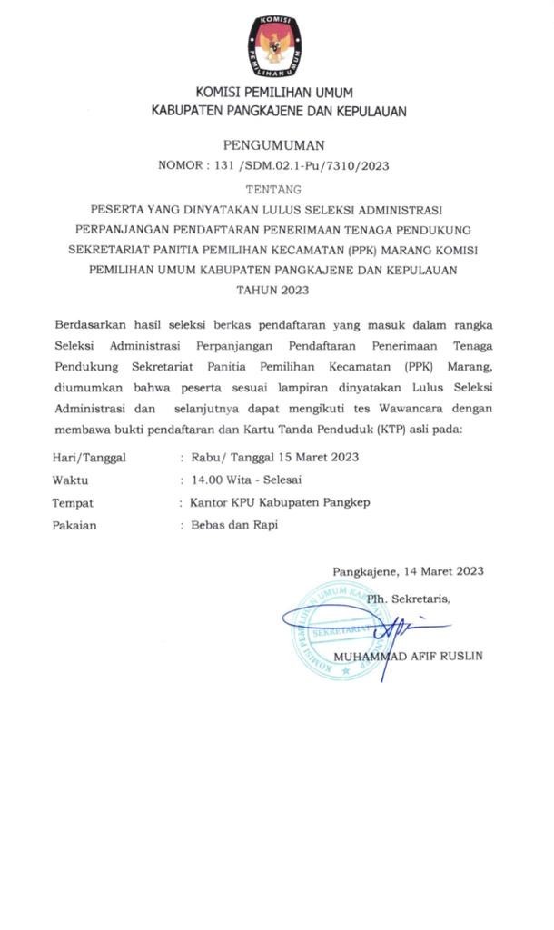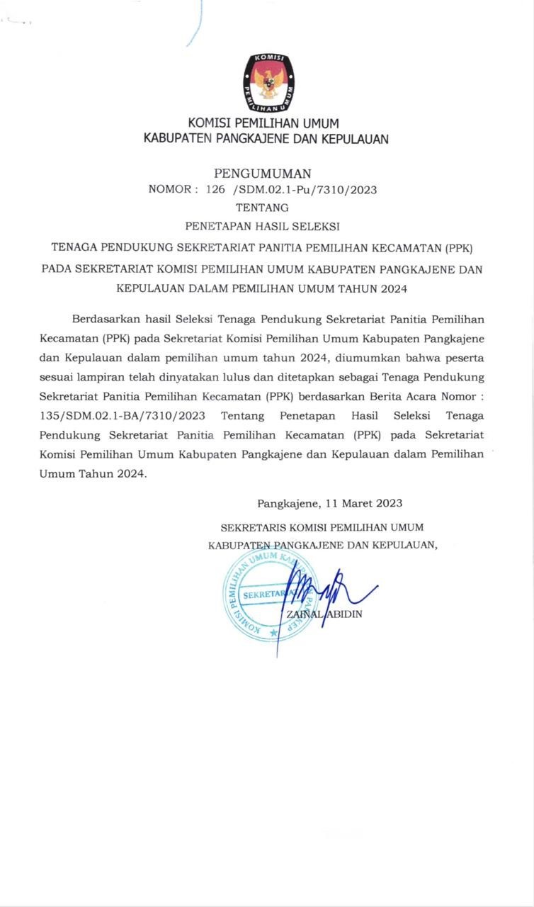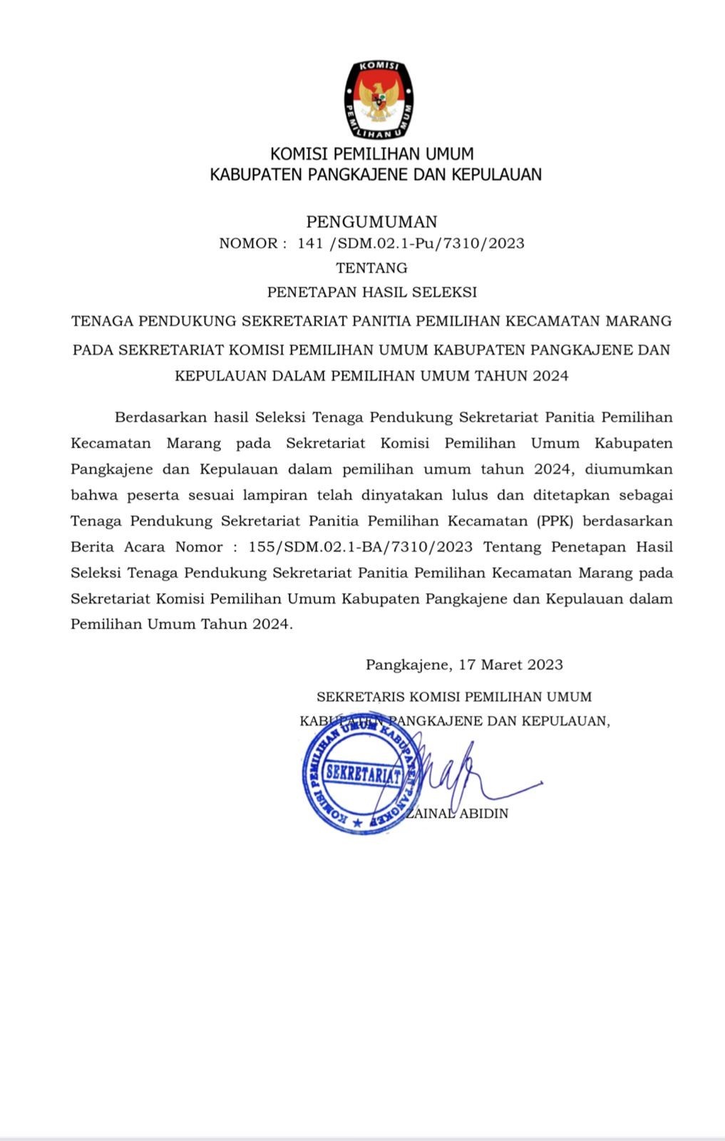 Berdasarkan hasil Seleksi Tenaga Pendukung Sekretariat Panitia Pemilihan Kecamatan Marang pada Sekretariat Komisi Pemilihan Umum Kabupaten Pangkajene dan Kepulauan dalam pemilihan umum tahun 2024, diumumkan bahwa peserta sesuai lampiran telah dinyatakan lulus dan ditetapkan sebagai Tenaga Pendukung Sekretariat Panitia Pemilihan Kecamatan (PPK), selengkapnya bisa diunduh DISINI