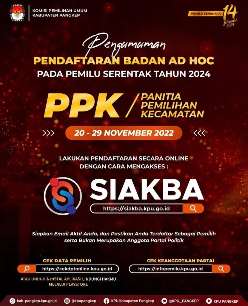 KPU Kabupaten Pangkajene Kepulauan mulai merekrut Panitia Pemilihan Kecamatan (PPK) hari ini, Minggu 20 November 2022. Pendaftaran dilakukan dengan sistem online, yaitu melalu SIAKBA, atau sistem informasi anggota KPU dan badan Adhoc. Disampaikan Koordinator Sosialisasi, Pendidikan Pemilih, Parmas dan SDM KPU Pangkep, Saiful Mujib, bahwa pendaftaran dapat dilakukan dari mulai tanggal 20 sampe tanggal 29 November 2022, dengan mengunjungi siakba.kpu.go.id. "Keterlibatan kita semua untuk suksesnya Pemilu 2024 sangat diharapkan, salah satu peran yang bisa dilakukan adalah bergabung menjadi penyelenggara Adhok, baik PPK, PPS atau KPPS. Semakin banyak yang mendaftar maka semakin baik, karena kita akan lebih selektif untuk mendapatkan PPK yang berintegritas dan punya komitmen," jelasnya. Terkait aplikasi pendaftaran ini Mujib menjelaskan, bahwa semakin kekinian, tehnologi akan semakin dibutuhkan. Hadirnya aplikasi ini adalah untuk mempermudah dalam pendaftaran PPK. Berikut ini link yang dapat diakses masyarakat jika membutuhkan informasi pendaftaran PPK; https://bit.ly/PengumumanPPKpemilu2024