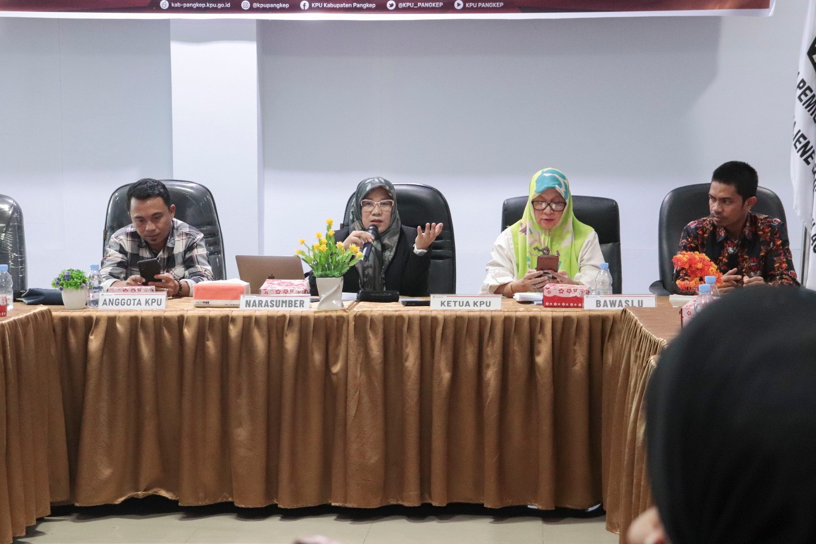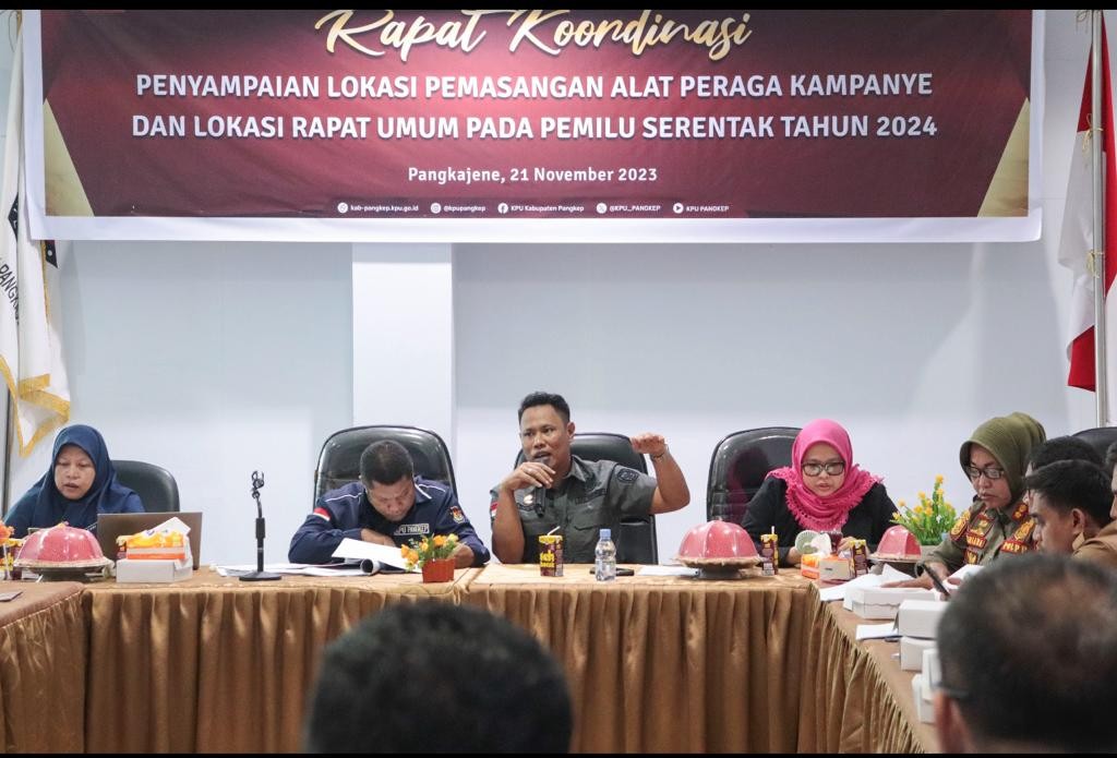 Pangkajene 21 November 2023, KPU Pangkep melaksanakan kegiatan Rapat Koordinasi Penyampaian Lokasi Pemiu tahun 2024 yang diaksanakan di Aula KPU Kabupaten Pangkep pada Selasa (22/11) Ketua KPU Pangkep, Ichlas dalam sambutannya, menjelaskan bahwa tujuan dilaksanakannya kegiatan ini adalah untuk menyamakan persepsi bagi semua pihak yang berkepentingan, khususnya bagi peserta pemilu. “Titik lokasi yang ditetapkan harus sesuai dengan keputusan dan standar di setiap dapil, selain itu, daftar petugas kampanye juga sudah harus diserahkan ke KPU Kabupaten Pangkep paling lambat 3 hari sebelum peaksanaan kampanye.” Sementara itu, Anggota KPU Divisi Sosialisasi, Pendidikan Pemilih, SDM dan Partisipasi Masyarakat, Hasanuddin G. Kuna mengungkapkan bahwa pemasangan Alat Peraga Kampanye (APK) harus sesuai dengan Surat Keputusan KPU Kabupaten Pangkep yang telah ditentukan. “Peserta Pemilu dapat menyerahkan APK yang dibuat secara mandiri 5 hari sebelum peaksanaan kampanye dan dihadiri oleh Bawaslu.” Acara inti dari Rapat Koordinasi ini adalah materi dari pihak Kapolres terkait Mekanisme Perizinan Pelaksanaan Kampanye dimana dalam materinya Kapolres yang diwakili oleh Kabag Ops Polres Pangkajene menyampaikan beberapa hal terkait syarat utama dalam pengajuan izin keramaian termasuk kegiatan kampanye. “Peserta kampanye harus mengajukan surat yang paling sedikit memuat bentuk dan maksud kegiatan, jumlah peserta dan penanggung jawab kegiatan kampanye yang akan dilaksanakan.” Kegiatan kampanye Pemilu Serentak tahun 2024 sendiri akan dimulai pada tanggal 28 November 2023 sampai dengan 10 Februari 2024, sebelum akhirnya memasuki masa tenang pada tanggal 11 Februari hingga 13 Februari 2024.